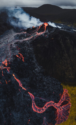 Approximately 20 miles to the city’s southwest, in Geldingardalur Valley, a 6000-year old volcano named Fagradalsfjall is currently underway spewing its molten guts over the surrounding area.