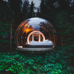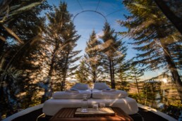 As night falls, you’ll settle into your private bubble — a snug little world surrounded by trees and silence. There’s no city glow out here, just the sound of the wind and the vastness of the Icelandic sky above. Through the clear walls, you’ll watch clouds drift, stars flicker to life, and maybe even catch the aurora painting the horizon. It’s part comfort, part wilderness — and completely unforgettable.