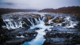 Hidden between mossy fields, Brúarfoss is often called Iceland’s Blue Waterfall — and it truly is. Its icy-blue water tumbles through black lava rock, creating a quiet, almost otherworldly beauty. It’s not loud or grand… just peaceful, pure, and unforgettable.